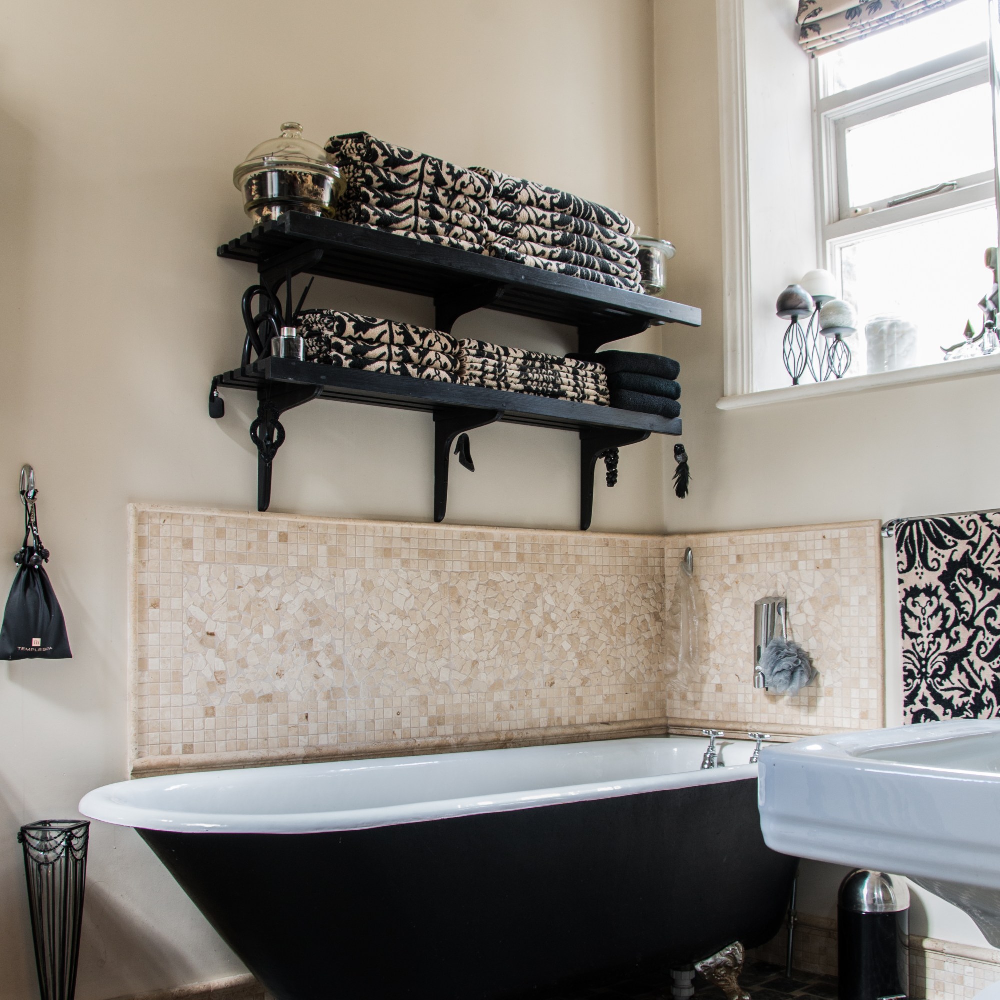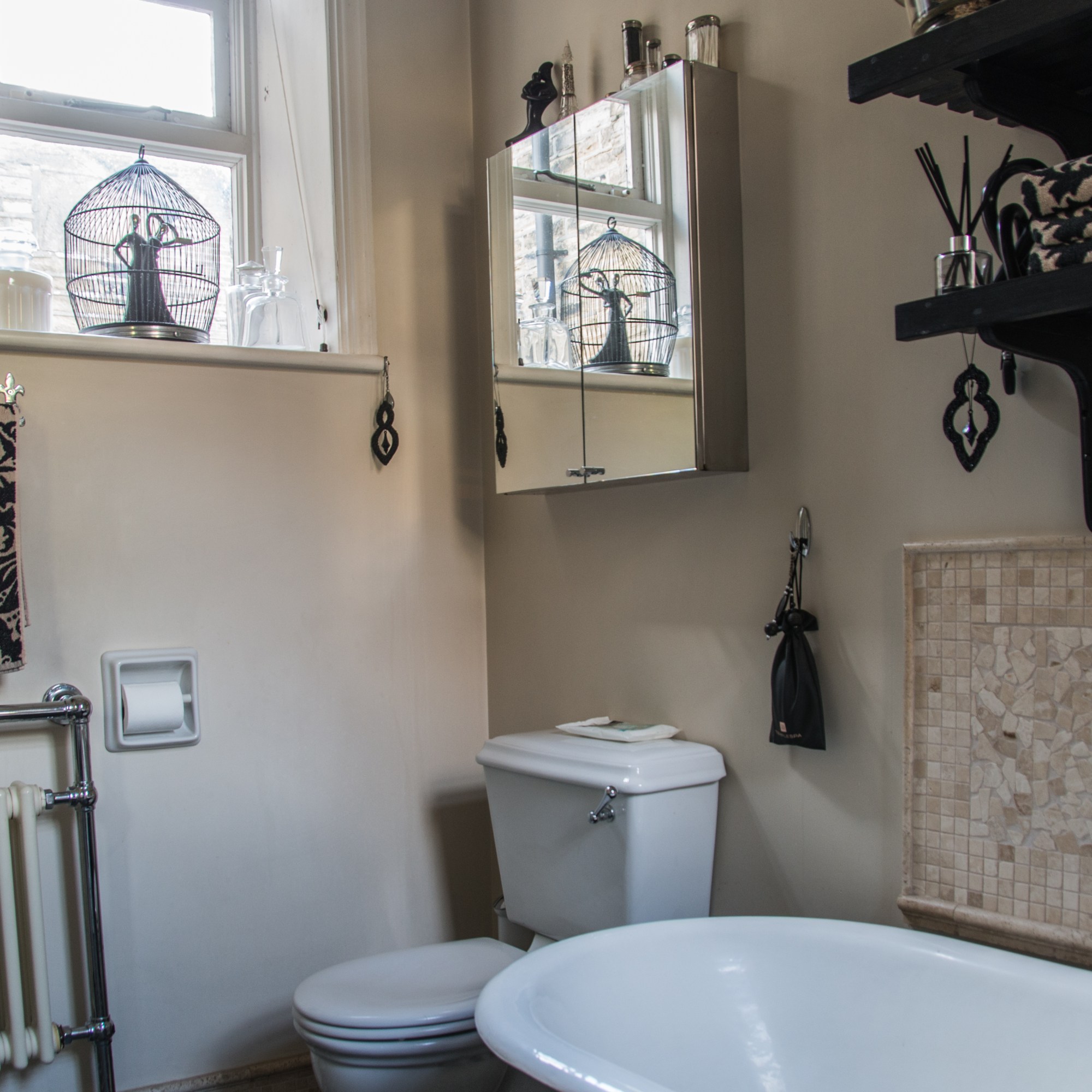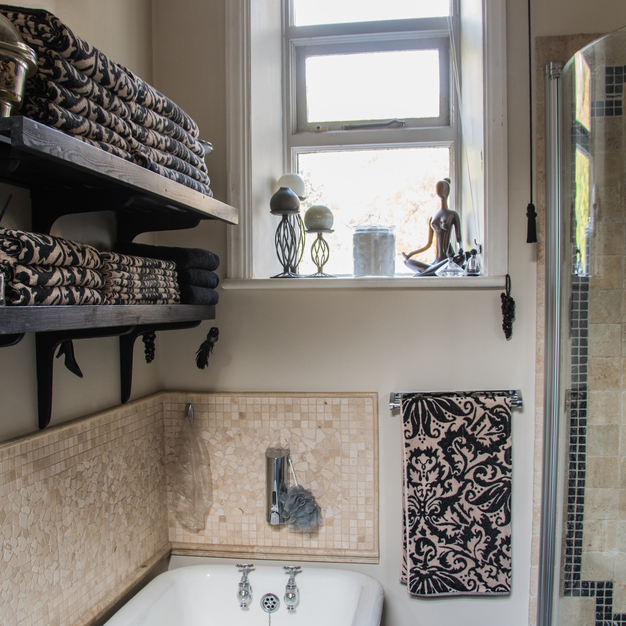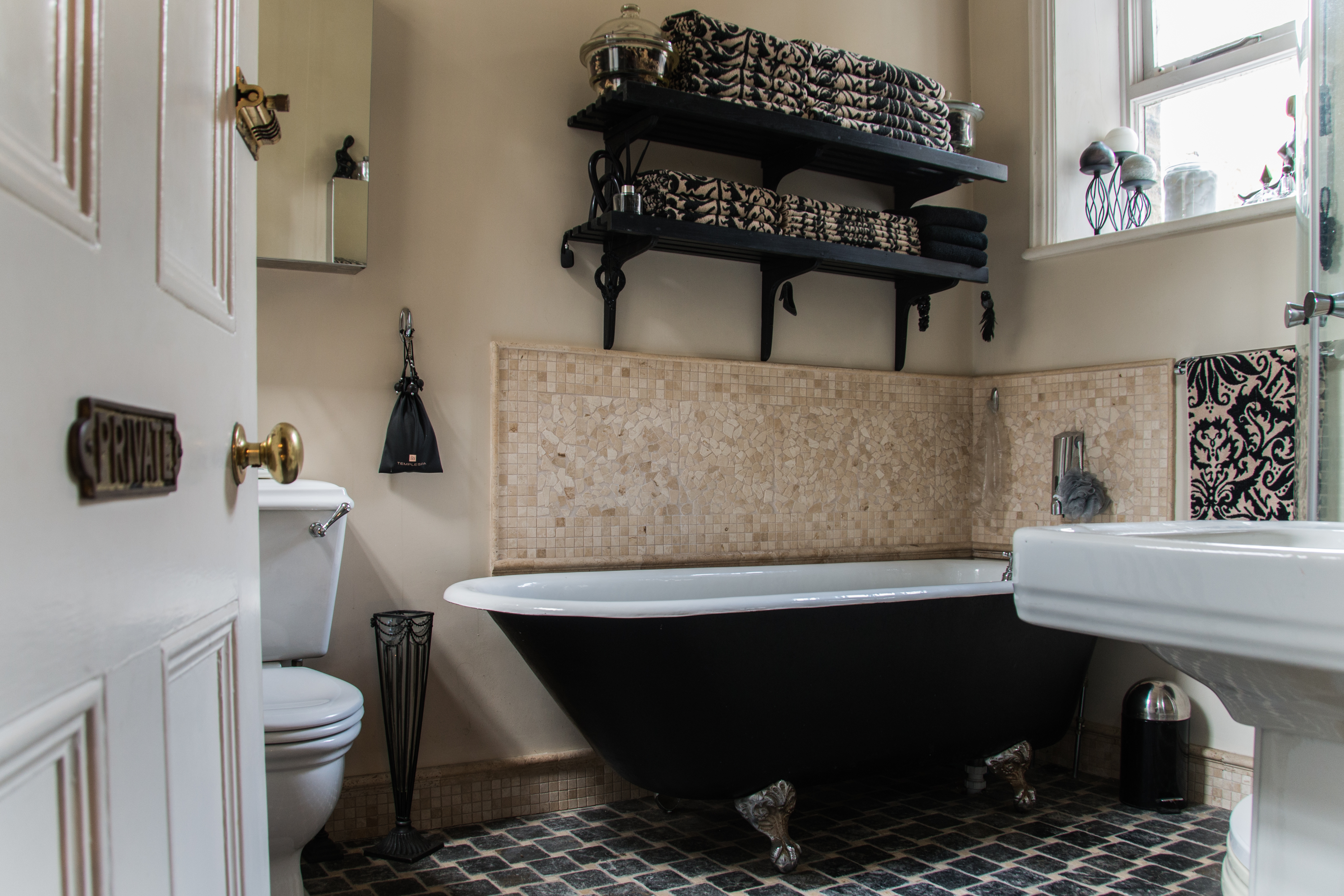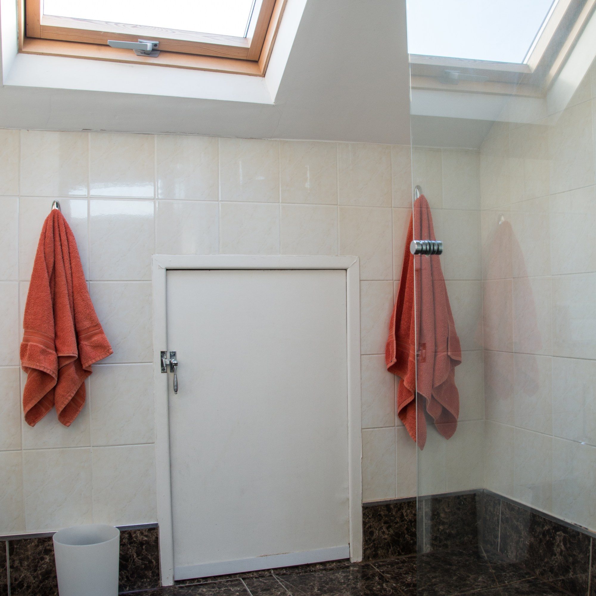 The house occupies two bathrooms for guests -on the first floor its of traditional style with toilet, original cast roll top bath, sink and corner shower. This earthy interior is very calming for one to take a hot relaxing bath. The wet room is situated on the top floor.