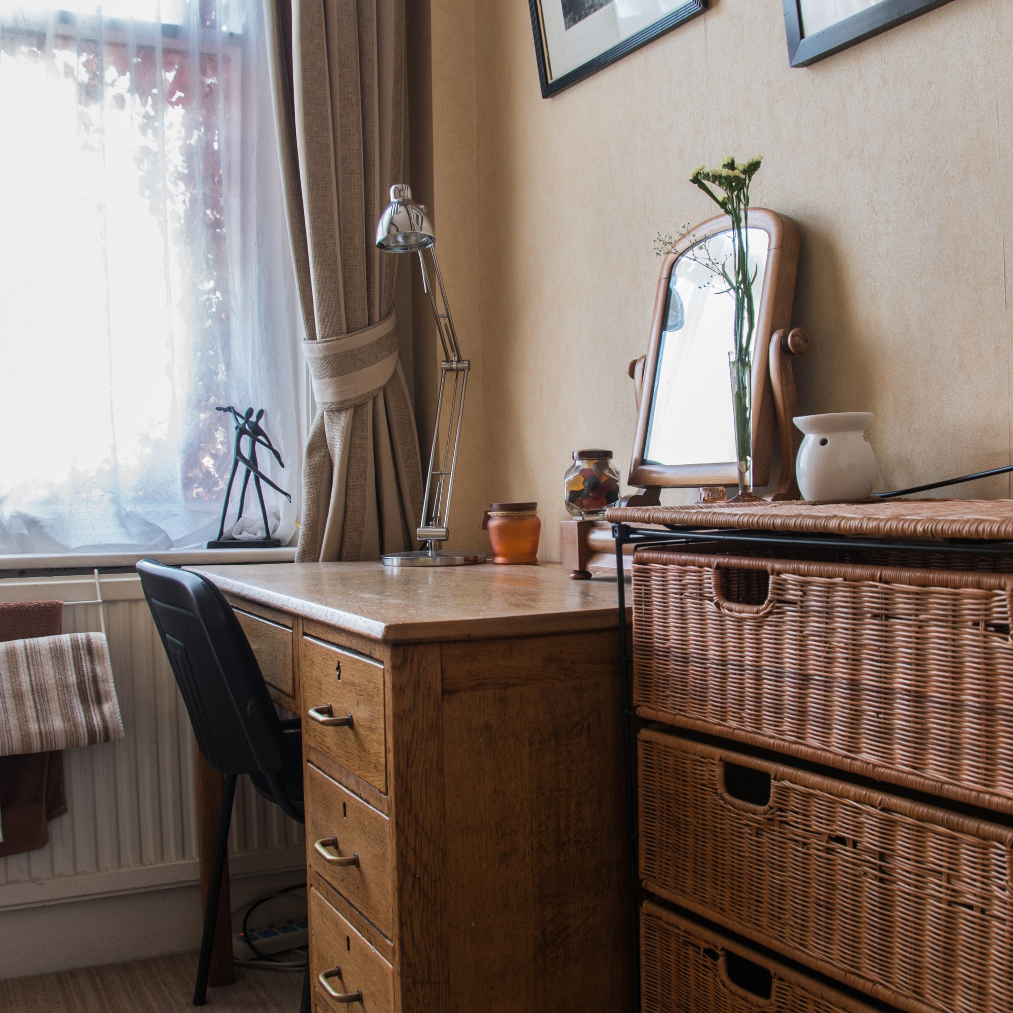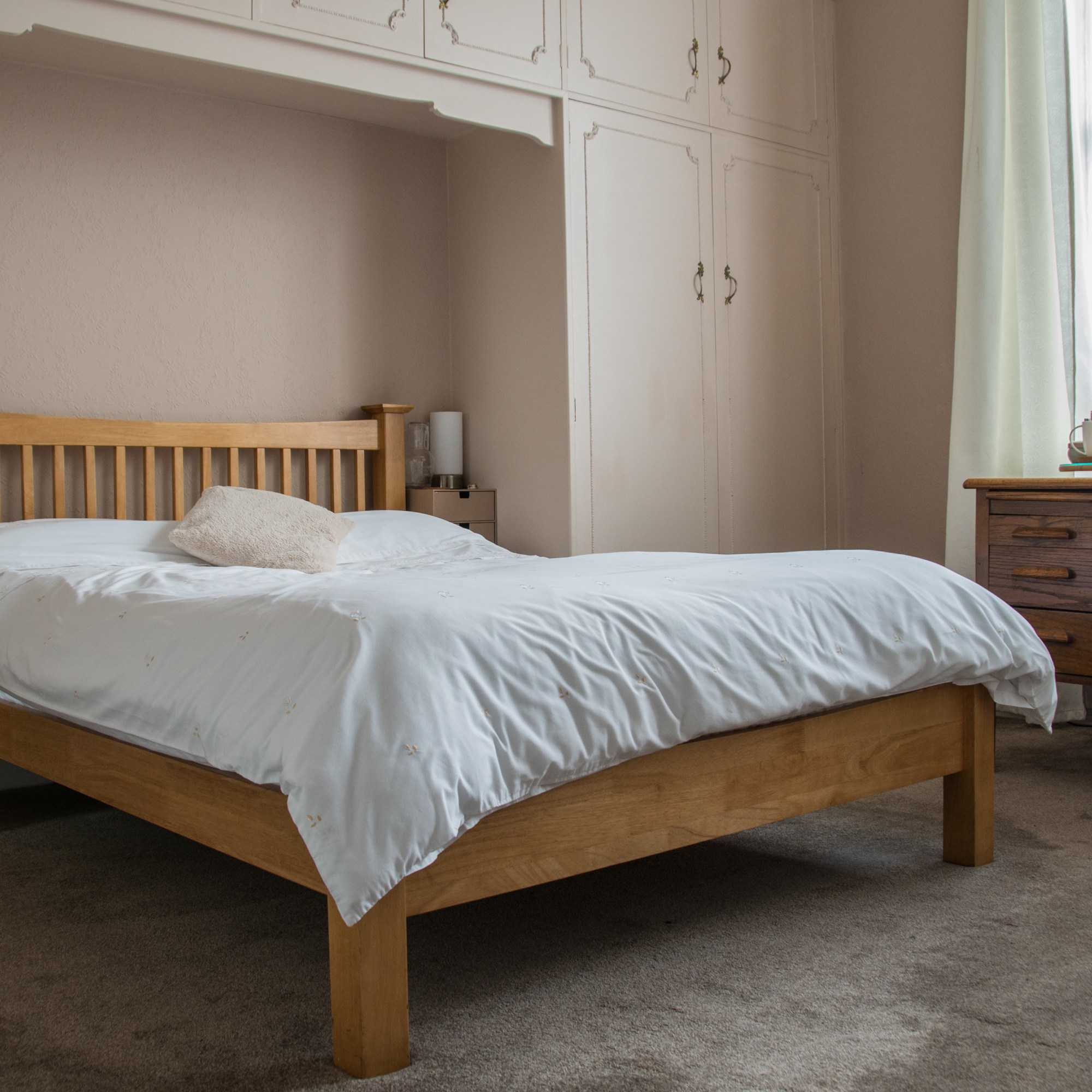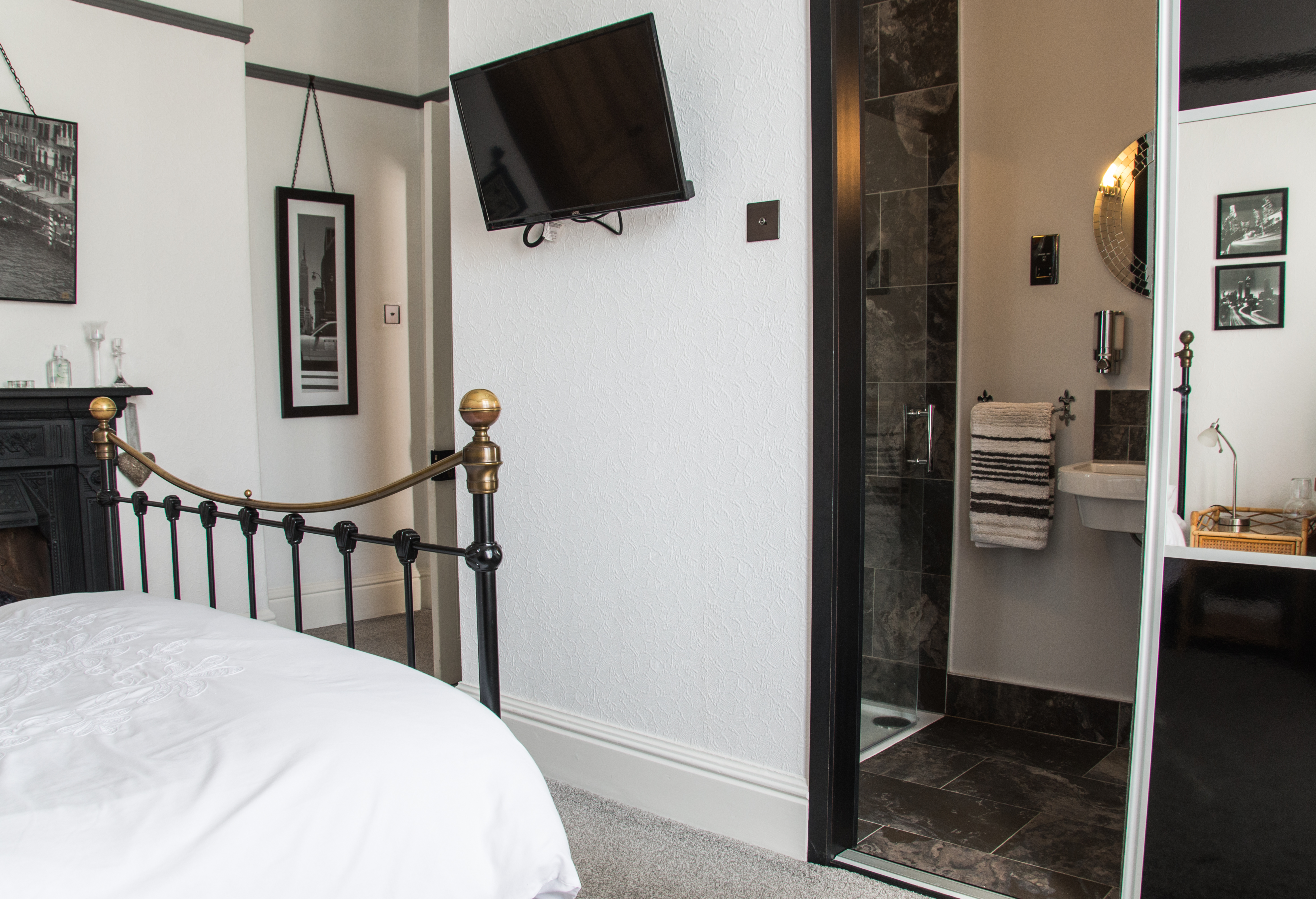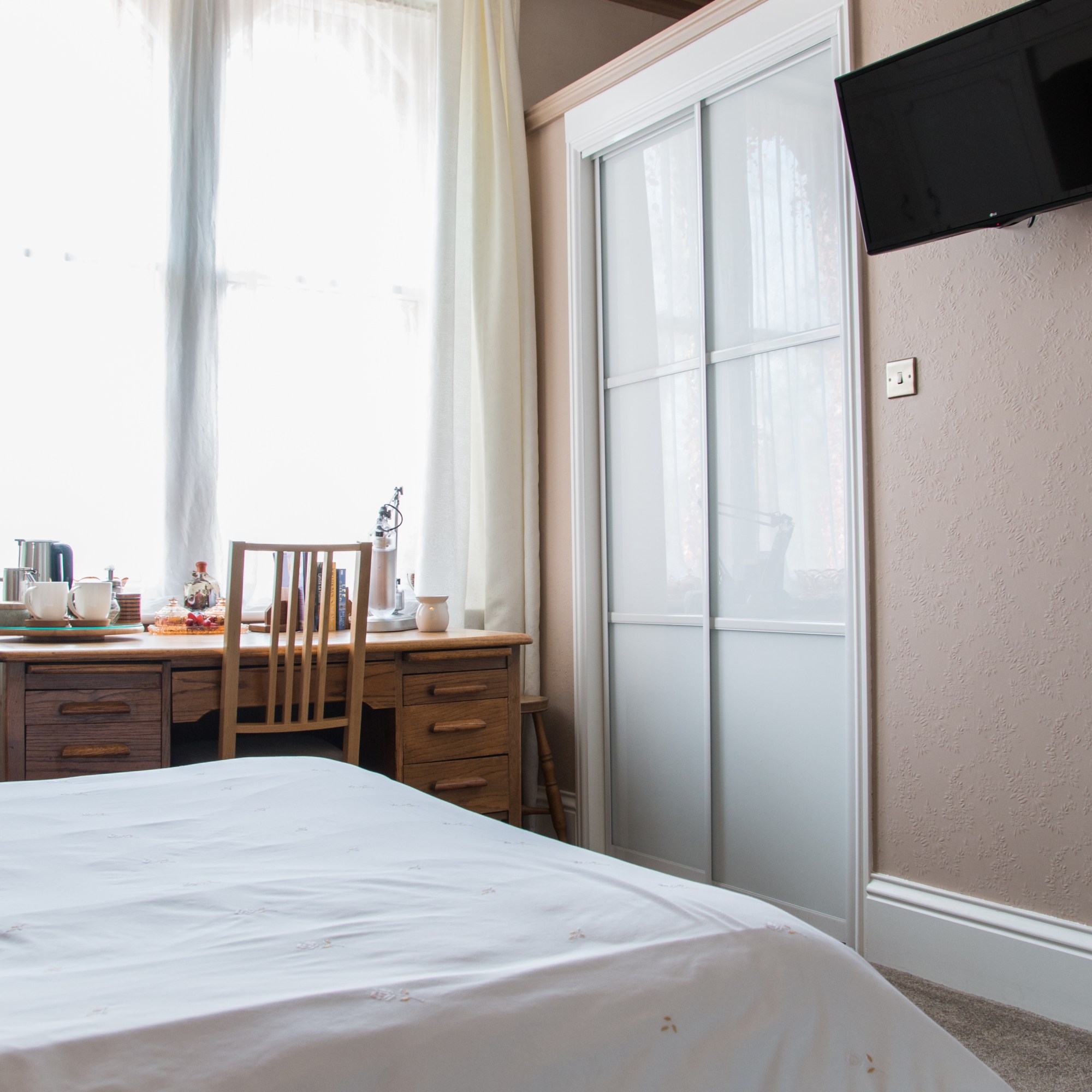 This bright and airy room accommodates a king size bed, matching desk/wardrobe and en-suite toilet/shower room.