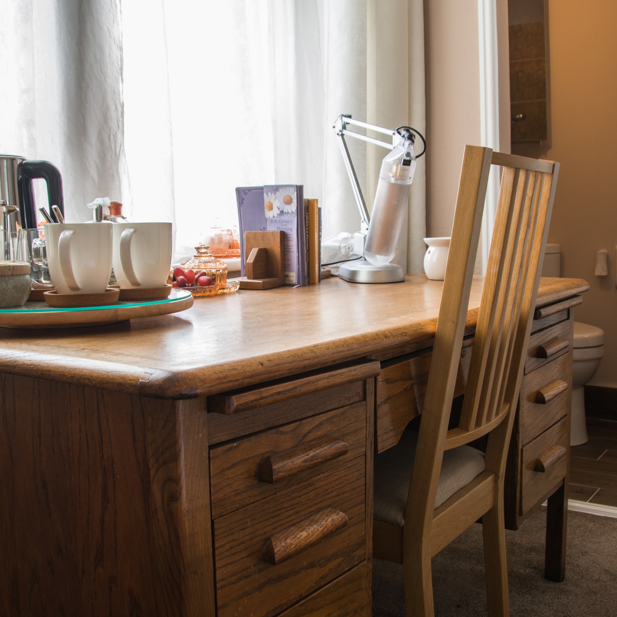 This particular room inspired….’patscosyplace’ due to its snug, but comfy sleeping experience. Trust me, I’ve slept in them all at sometime or another. He,he! The desk sitting right next to the window, again, provides lots of natural light.